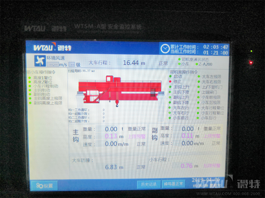 微特WTSM-A型起重機(jī)安全監(jiān)控系統(tǒng)具有實(shí)時(shí)監(jiān)控,動(dòng)態(tài)顯示,聲光報(bào)警,數(shù)據(jù)存儲(chǔ),斷電記憶以及密碼保護(hù)等功能,且儀表本身設(shè)計(jì)具有抗干擾性強(qiáng),操作界面方面,通用性強(qiáng)等優(yōu)點(diǎn)。經(jīng)過(guò)微特技術(shù)工程師的現(xiàn)場(chǎng)安裝調(diào)試完后順利通過(guò)了客戶及當(dāng)?shù)靥貦z機(jī)構(gòu)的驗(yàn)收,贏得了客戶的認(rèn)可,也為我們今后在淄博地區(qū)業(yè)務(wù)的深入開(kāi)展起到了一個(gè)良好的開(kāi)端。
