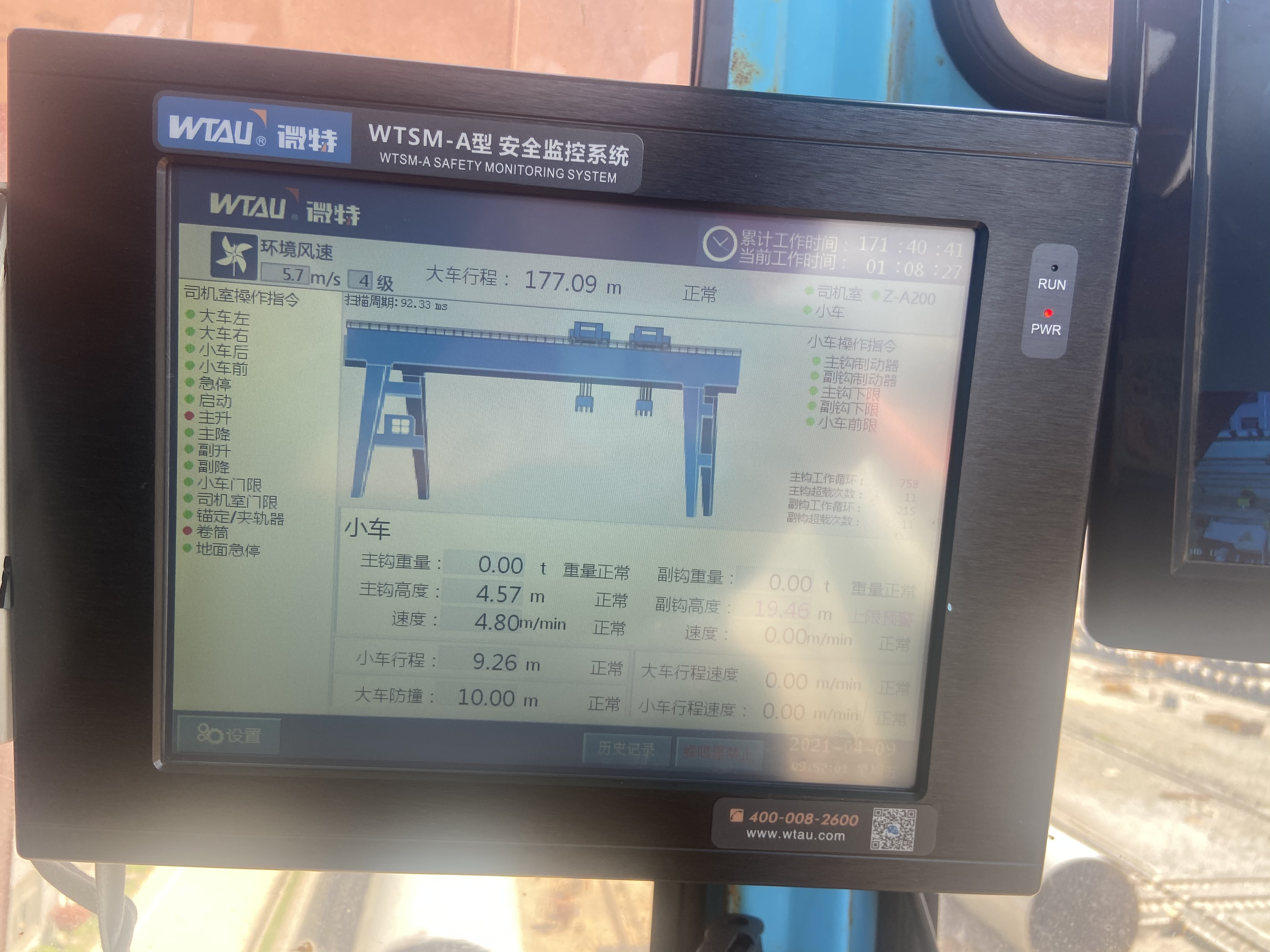 WTSM-A型龍門吊安全監(jiān)控管理系統(tǒng)采集了司機(jī)室下位機(jī),小車下位機(jī)及監(jiān)視門機(jī)各個動作及運(yùn)行參數(shù),以及重量、小車行程各限位和操作指令狀態(tài)。各狀態(tài)指示燈在顯示紅燈時代表門機(jī)對應(yīng)機(jī)構(gòu)已動作,綠燈代表對應(yīng)機(jī)構(gòu)無動作,各重量行程及速度會在屏上顯示出對應(yīng)的數(shù)據(jù)。