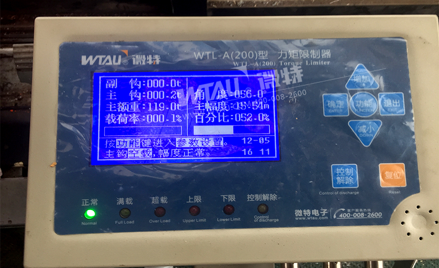 主機(jī)WTL-A200型力矩限制器儀表安裝在駕駛室里,該儀表可實(shí)時顯示當(dāng)前重量,幅度,角度,額重及工況等參數(shù)。