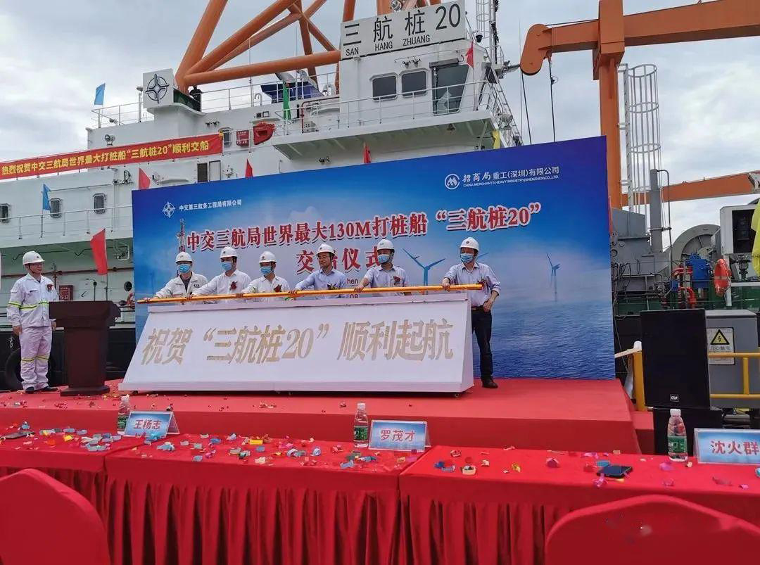 2020年5月8日上午,由招商局重工(深圳)有限公司為中交三航局建造的130M打樁船“三航樁20”在招商工業(yè)深圳孖洲島基地舉行了交船儀式,標志著目前世界最大的打樁船正式誕生。中交三航局副總經理尹建兵、中國船級社深圳分社總經理羅茂才、招商局重工(深圳)有限公司總經理王楊志及有關負責人出席了交船儀式。