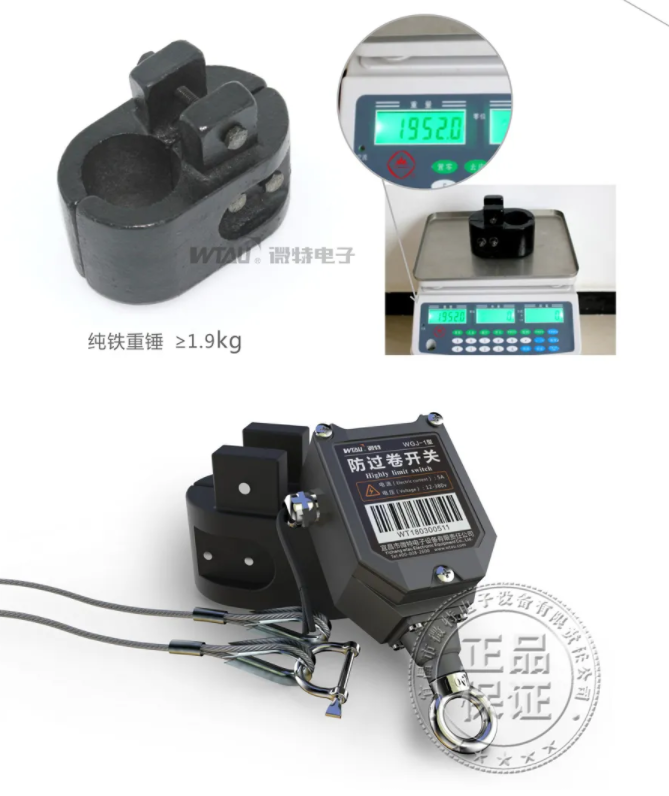 WGJ型防過卷開關(鉤頭限位開關/重錘限位開關),是用于起重機械鋼絲繩防過卷限位的一種電器自動保護開關。它與一適當重量的重錘配套,利用吊鉤的上下運動托起或放下重錘時斷開或?qū)ㄩ_關,實現(xiàn)自動切斷卷揚機動力電源連通剎車系統(tǒng),達到限制鋼絲繩過卷的目的,以及達到吊鉤在一定高度內(nèi)升降的目的。