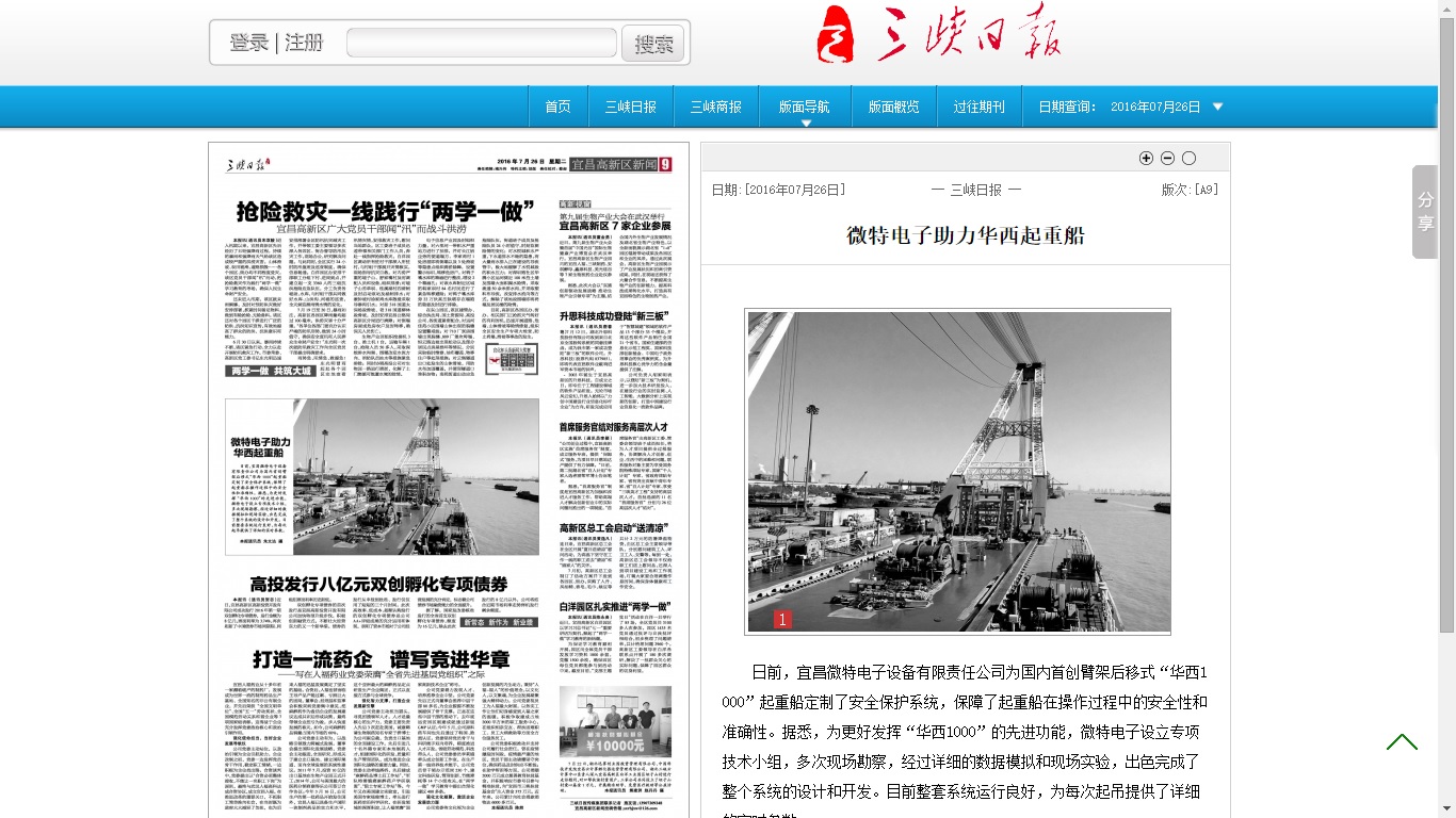 7月26日,三峽日報(bào)A9版刊登了題為《微特電子助力華西起重船》的圖文消息。文中介紹了我司為國內(nèi)首創(chuàng)臂架后移式“華西1000”起重船定制了安全保護(hù)系統(tǒng)的基本情況。