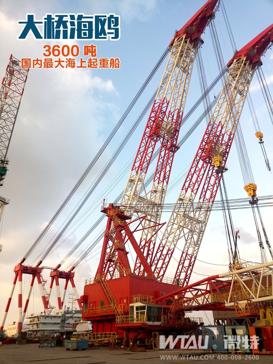 “大橋海鷗”3600T起重船為中國自主研發(fā)設(shè)計(jì)制造,平潭海峽大橋80米和88米鋼桁梁的整孔吊裝架設(shè),需要起重量3200噸以上、吊高110米的起重船。為滿足平潭海峽公鐵兩用大橋整孔鋼梁架設(shè)及大型構(gòu)件的海上吊裝需要,2015年初,中鐵大橋局投資3.4億元設(shè)計(jì)建造了這艘3600噸起重船。它是中鐵大橋局“走向海洋”戰(zhàn)略實(shí)施的重要裝備支撐。
