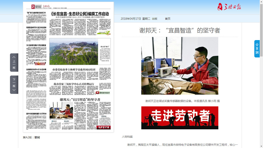 2018年4月17日,三峽日?qǐng)?bào)與三峽宜昌網(wǎng)同步發(fā)布了題為“走進(jìn)勞動(dòng)者|謝邦天:“宜昌智造”的堅(jiān)守者”的專訪文章,贊揚(yáng)了微特研發(fā)工程師堅(jiān)守崗位,默默耕耘,為“宜昌智造”貢獻(xiàn)力量。