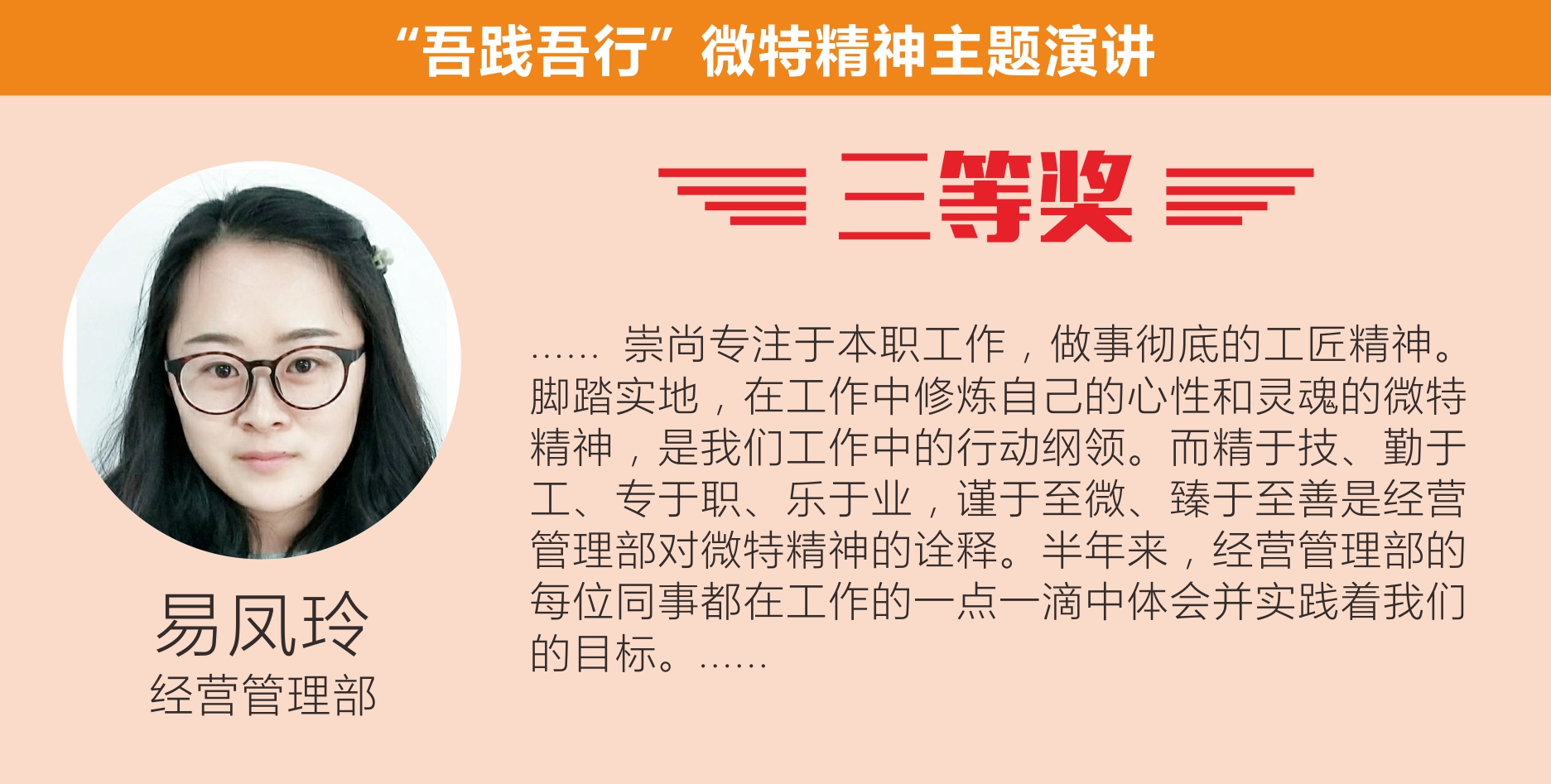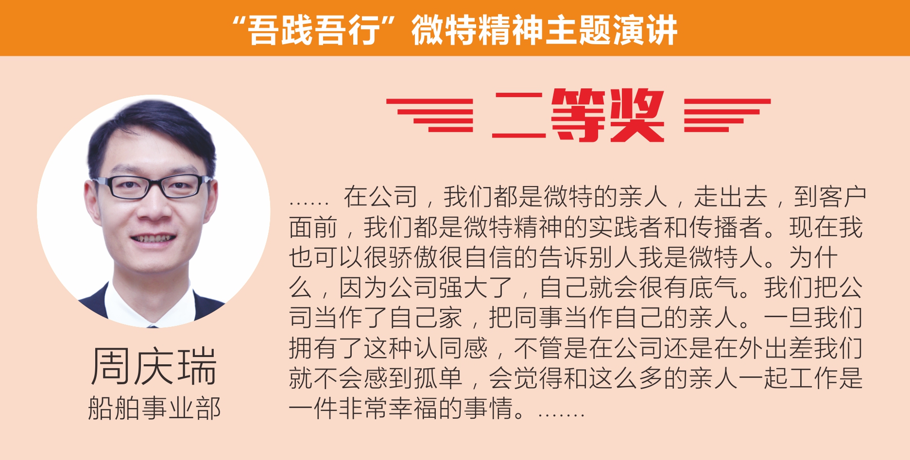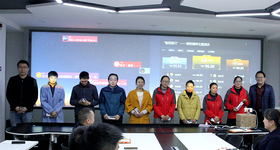 2018年11月17日,2018“吾踐吾行”微特精神主題演講賽在公司隆重舉行,總經(jīng)理聶道靜和各部門主管參加活動并做為評委對演講者評分。此次比賽在公司內(nèi)部全程網(wǎng)絡直播,很多出差在外的人員也可以與現(xiàn)場互動。此次活動各部門積極踴躍參與,優(yōu)選出12名參賽選手現(xiàn)場演講,選手們結(jié)合微特精神闡述了自己一年以來對工作的感悟和啟發(fā)。