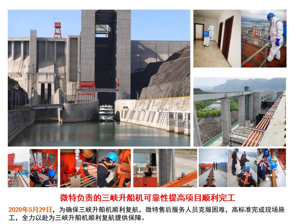 在這特殊的一年里,微特人攻堅克難完成全球規(guī)模最大、技術難度最高的三峽升船機的閘首橋機可靠性提高項目,為三峽升船機順利復航提供保障;微特人敢為人先承接定制化攀鋼起重機智能運維系統(tǒng)、振華重工卸船機稱重系統(tǒng)等重大項目,貼身為一流鋼鐵船舶企業(yè)服務;微特人開拓進取與中水七局、中建四局等企業(yè)合作研發(fā)起重機運行關鍵技術項目取得重大突破;微特人勤勉努力不斷深化與全球最大石油生產(chǎn)公司沙特 Aramco、全球頂級起重機品牌DEMAG、Liebherr之間的合作,成果豐碩。