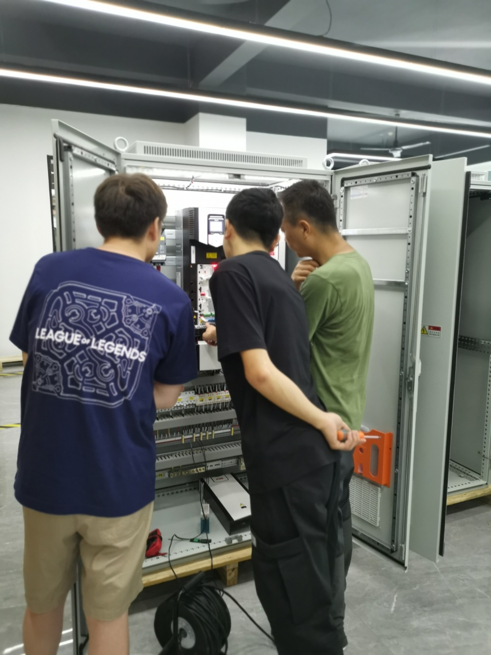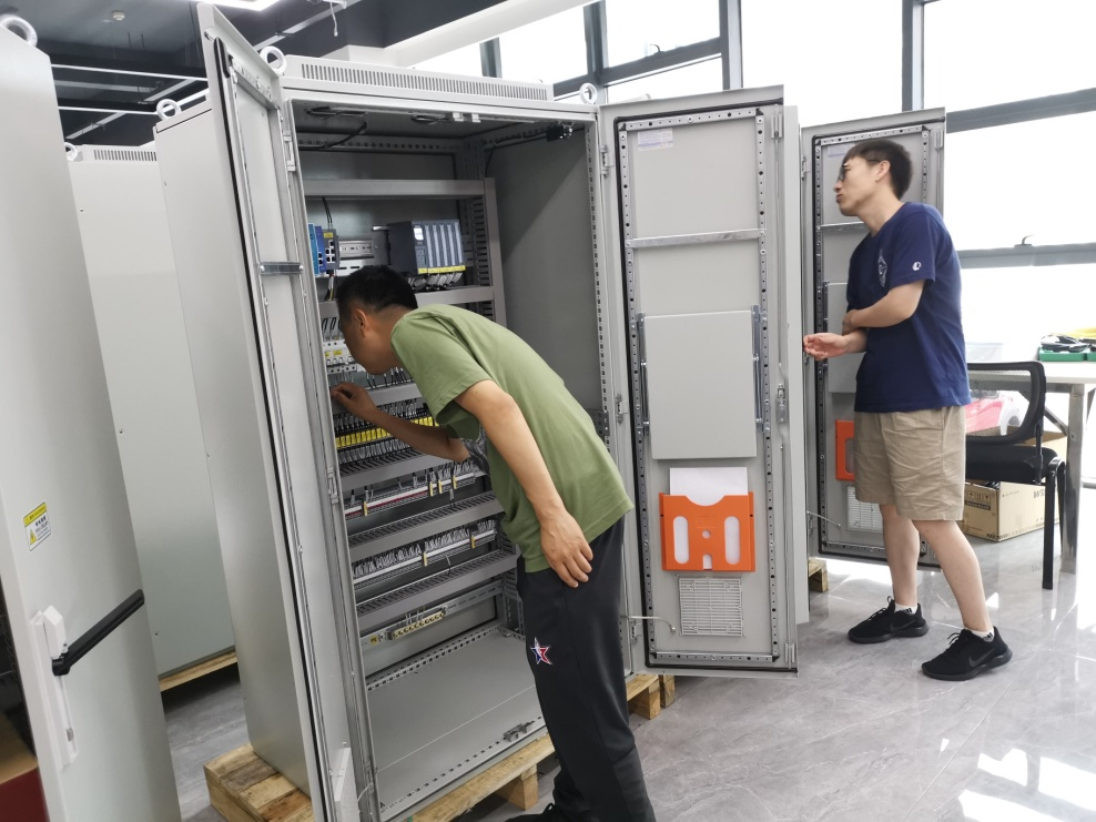 大朝山電站驗收代表在微特電氣車間檢查盤柜生產(chǎn)工藝以及微特電氣工程師對變頻控制柜進行上電試驗