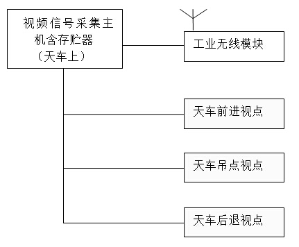 本方案視屏系統(tǒng)的配置結(jié)構(gòu)主要有:3路攝像頭和存儲(chǔ)器、、無(wú)線模組、顯示器等主體結(jié)構(gòu)構(gòu)成。主要監(jiān)視天車(chē)前行區(qū)域、天車(chē)后退區(qū)域、天車(chē)吊點(diǎn)區(qū)域的工作面為主要監(jiān)視區(qū)域,信號(hào)通過(guò)無(wú)線模塊傳輸至安裝在大梁上的視屏顯示器顯示