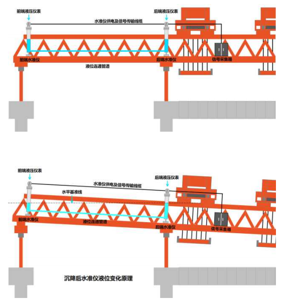 此次我們主要針對架橋機過孔和架梁過程中的前高后低姿態(tài),以及整機橫移過程中前、中支腿軌道平行度狀態(tài)采取實時監(jiān)控,讓架橋機在施工過程中保持良好的運行姿態(tài),減少失穩(wěn)帶來的安全風(fēng)險,使架橋機運行更安全,管理更高效。