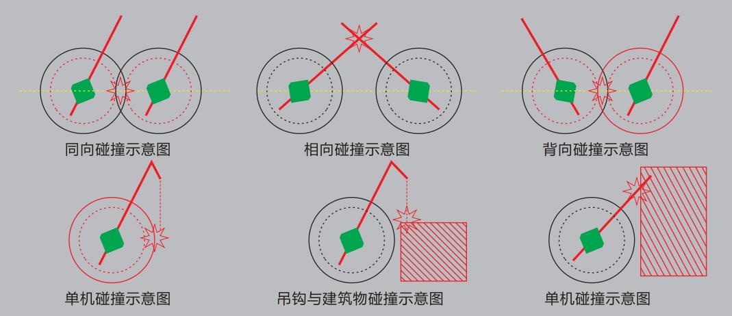 區(qū)域主動防碰撞系統(tǒng): 通過雷達主動監(jiān)測起重機易碰運動部位路徑,探測區(qū)域空間內(nèi)是否有障礙物,以此來避免吊機與吊機間,回轉部位與其它物體、臂架與周邊物體之間的區(qū)域空間是否安全,在安全區(qū)被入侵時發(fā)出聲、光報警,甚至給出止停控制信號,實現(xiàn)主動防碰撞監(jiān)測保障設備安全。