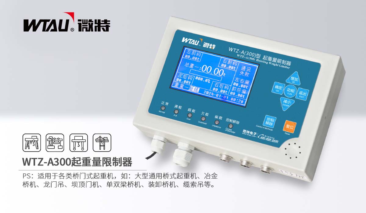 WTZ-A300起重量限制器(超載限制器)為微特研發(fā)生產(chǎn)的藍(lán)屏顯示起重量限制器,已在市場服役超過15年。該型號起重量限制器具有運(yùn)行穩(wěn)定可靠、界面顯示簡潔、低功耗高精度、數(shù)據(jù)采集及輸出控制靈活可調(diào)等特點(diǎn)。