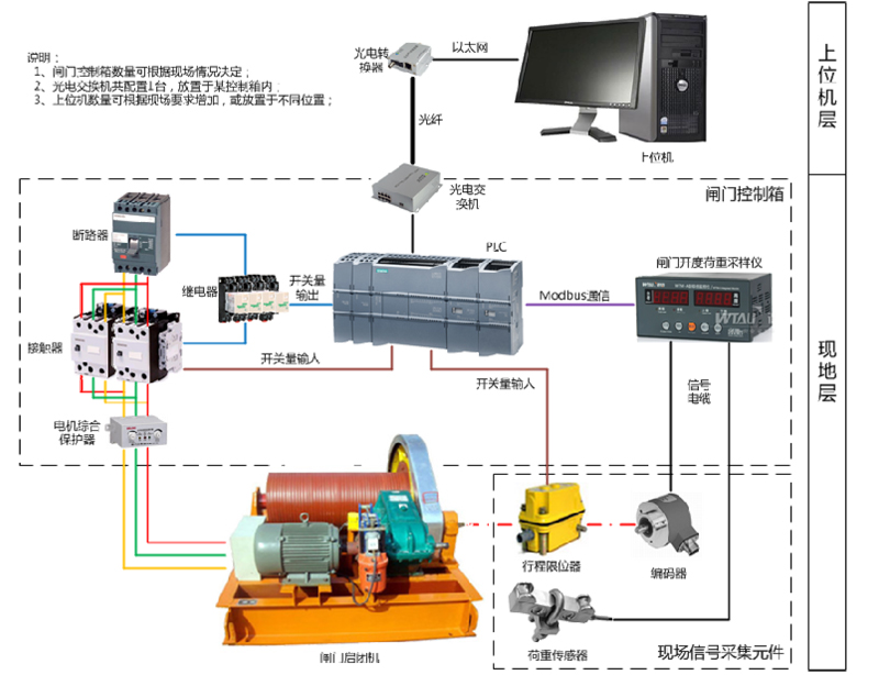 控制系統(tǒng)采用分層分布式結(jié)構(gòu),整個(gè)系統(tǒng)分為兩層,上層為中控室監(jiān)控單元、下層為現(xiàn)地操作單元。實(shí)現(xiàn)對(duì)所有閘門(mén)的監(jiān)視、控制;現(xiàn)地層以PLC為主控元件實(shí)現(xiàn)控制。根據(jù)閘門(mén)數(shù)量配置控制箱,每扇閘門(mén)各配置1臺(tái)控制箱,放置于被控閘門(mén)啟閉機(jī)旁。既可在上位機(jī)實(shí)現(xiàn)對(duì)閘門(mén)的遠(yuǎn)程監(jiān)控,亦可通過(guò)控制箱上的按鈕對(duì)閘門(mén)進(jìn)行現(xiàn)地操作。