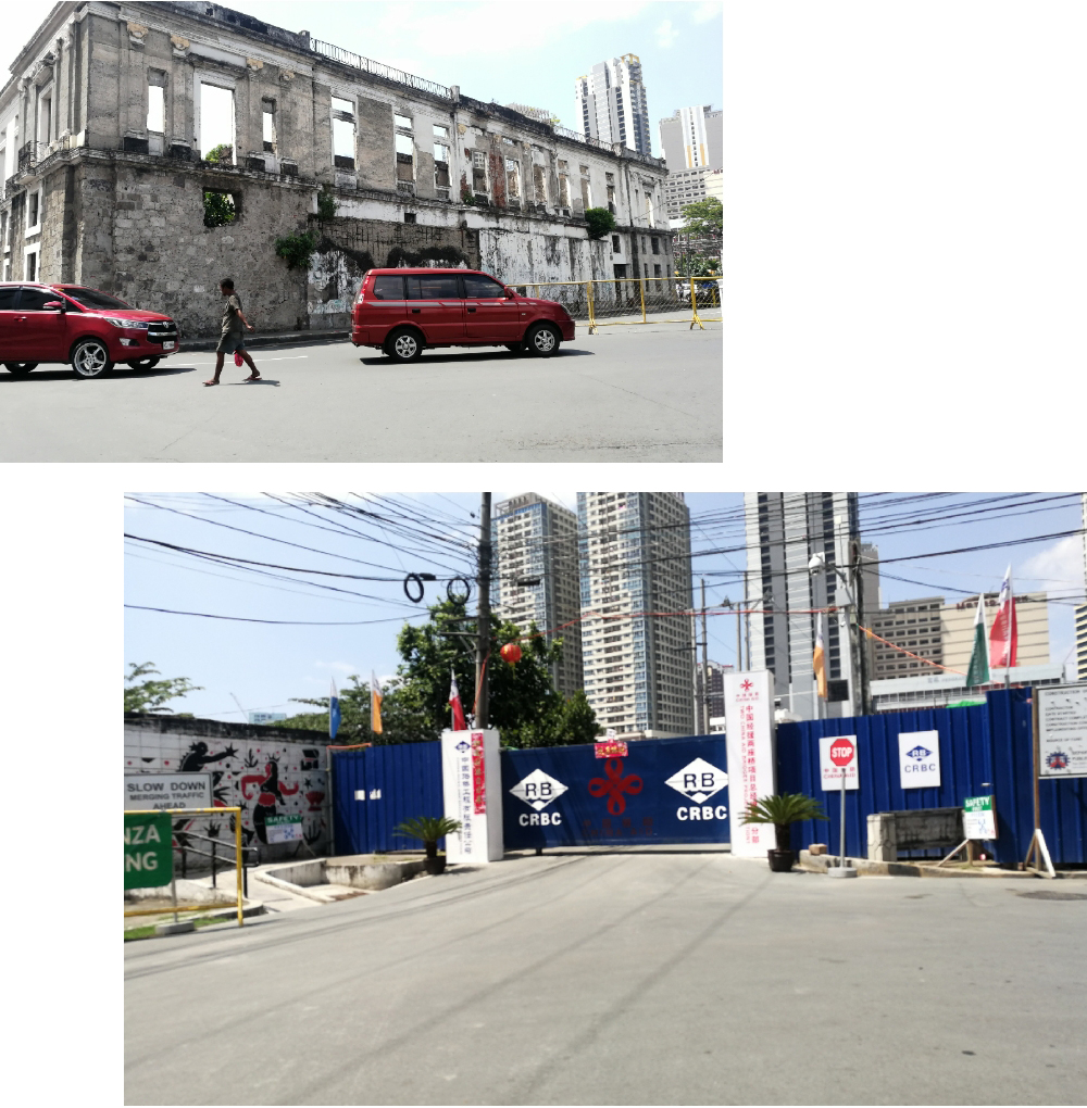 ▲滿目瘡痍的建筑旁邊,有一個(gè)掛著“中國(guó)援建”的項(xiàng)目正在施工中